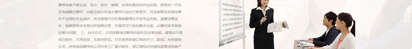 摩格擁有北京武漢廣州三地四廠,店主只需負責銷售安裝,窗簾設計、制作、搭配均由公司負責,讓經銷商徹底擺脫庫存積壓、制作工藝差等問題。